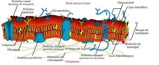 | Keywords: Cell membrane detailed diagram ca.svg La membrana cel·lular o membrana plasmàtica comuna a tots els éssers vius és una bicapa lipídica semipermeable A més dels lípids conté altres molècules com proteïnes implicades a una gran varietat de processos cel·lulars És també el punt d'ancoratge del citoesquelet cel·lular i si n'hi ha de la paret cel·lular Traducció de Cell_membrane_detailed_diagram svg 2007-05-09 LadyofHats traducció User imartin6 LadyofHats Other versions/Cell membrane detailed diagram translation possible SVG biology diagrams in Catalan Cell membrane Ultrastructure diagrams Semipermeable membrane |