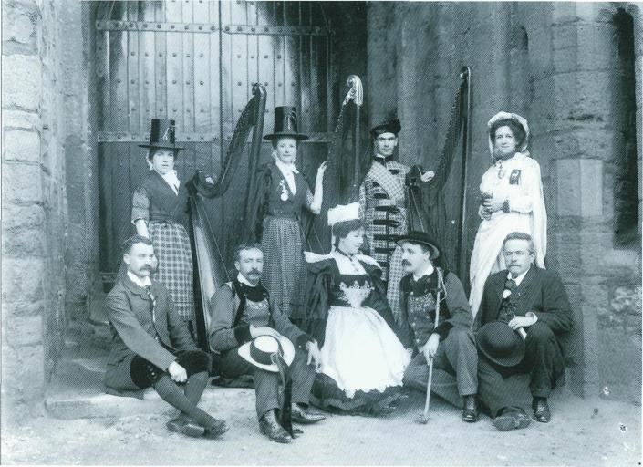 Keywords: Celtic congress 1904.jpg en photograph of delegates at the Celtic Congress 1904 Caernarfon Back row Maggie Jones harpist of Arfon ; Mrs Gruffydd Richards chief harpist of Gwent David Roberts blind harpist of Mawddwy Gwyneth Vaughan Front row Pedwr James Emile Hamonic Lena Botrel Theodore Botrel Professor Paul Barbier A Book of Mad Celts John Wickens d 1936 1904 Celtic art National costumes Frame harps Théodore Botrel Lena Botrel PD-old Émile Hamonic |