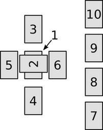 Keywords: Celtic Cross Spread - Banzhaf.svg en Celtic cross tarot spread according to Hajo Banzhaf Das Tarot-Handbuch 10 Auflage Hugendubel München 1998 ISBN 3-88034-697-6 p 232 2016-04-28 own WolfgangRieger other versions cc-zero Tarot spread