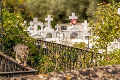Keywords: cemetery cat feline look keeper supervisor homeless