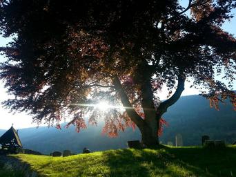 Keywords: cemetery graveyard graves church gravestone religion cemetary monument old death grief burial red cross mourning tree sunlight sunshine sun leaves sunset tomb peace loss headstone mourn widow autumn norway