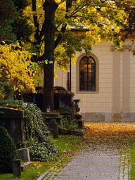 Keywords: cemetery rakowice kraków alley autumn window stained glass window church temple monument