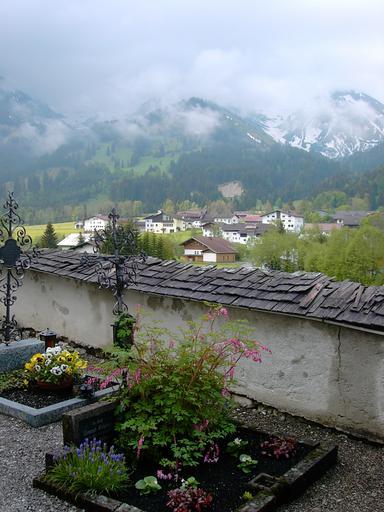 Keywords: cemetery tyrol cemetery wall cross wrought iron art grave graves mountains panorama sky clouds