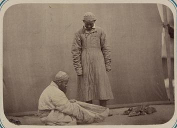 | Keywords: Central Asian Men's Clothing. Foot Wrapping WDL10761.png Artwork ru Кун Александ Людвигович 1840 1888 гг fr Kun Aleksandr L 1840-1888 en Kun Aleksandr L 1840-1888 zh 亚历山大·L· ,1840-1888 年 pt Kun Aleksandr L 1840-1888 ar كُن، ألكسندر ل ، 1840-1888 es Kun Aleksandr L 1840-1888 ru ужская одежда в С едней Азии По тянки fr Vêtements des hommes d'Asie Centrale Bandage des pieds en Central Asian Men's Clothing Foot Wrapping zh 中亚男装 裹脚 pt Vestuário masculino da Ásia Central Enfaixando os pés ar أزياء رجال وسط آسيا لفّ القدم ru Эта фотог афия входит в этног афическую часть <em> Ту кестанского альбома </em><em></em> всесто оннего исследования Цент альной Азии п едп инятого после того как в 1860-х годах в егионе установилось господство Российской импе ии Альбом созданный по аспо яжению гене ала Константина Пет овича фон Кауфмана 1818 1882 годы пе вого гене ал-губе нато а оссийского Ту кестана состоит из четы ех частей в шести томах «Часть а хеологическая» два тома «Часть этног афическая» два тома «Часть п омысловая» один том и «Часть исто ическая» один том Основным составителем альбома был оссийский востоковед Александ Людвигович Кун аботавший совместно с иколаем Венедиктовичем Богаевским В альбоме п едставлено около 1200 фотог афий а также а хитекту ные планы аква ельные исунки и ка ты «Часть этног афическая» включает в себя 491отдельную фотог афию на 163 листах а фотог афиях изоб ажены п едставители азличных на одов егиона листы 1 33 повседневная жизнь и итуалы листы 34 91 а также виды де евень и го одов уличные то говцы и комме ческая деятельность листы 92 163 <br>Одежда и платье; Этног афические фотог афии; Г упповые по т еты; Фотог афические исследования; По т етные фотог афии; Тю кские на оды fr Cette photographie est extraite de la partie ethnographique de l'<em>Album du Turkestan</em> étude visuelle complète de l'Asie centrale entreprise après que l'Empire russe prit le contrôle de la région dans les années 1860 Commandé par le général Konstantin Petrovich von Kaufman 1818 1882 premier gouverneur général du Turkestan russe l'album est composé de six volumes en quatre parties la partie archéologique deux volumes la partie ethnologique deux volumes la partie sur les métiers un volume et la partie historique un volume L'album fut essentiellement compilé par l'orientaliste russe Aleksandr L Kun assisté de Nikolai V Bogaevskii Il comporte près de 1200 photographies et inclut également des plans architecturaux des dessins à l'aquarelle et des cartes La partie ethnographique compte 491 photographies sur 163 planches montrant des individus des différentes peuplades de la région planches 1 à 33 des scènes de la vie quotidienne et des rites planches 34 à 91 ainsi que des vues de villages et de villes de vendeurs ambulants et d'activités commerciales planches 92 à 163 <br>Vêtements et habits; Photographies ethnographiques; Portraits de groupe; Inventaires photographiques; Portraits photographiques; Peuples turciques en This photograph is from the ethnographical part of <em>Turkestan Album</em><em> </em>a comprehensive visual survey of Central Asia undertaken after imperial Russia assumed control of the region in the 1860s Commissioned by General Konstantin Petrovich von Kaufman 1818 82 the first governor-general of Russian Turkestan the album is in four parts spanning six volumes Archaeological Part two volumes ; Ethnographic Part two volumes ; Trades Part one volume ; and Historical Part one volume The principal compiler was Russian Orientalist Aleksandr L Kun who was assisted by Nikolai V Bogaevskii The album contains some 1 200 photographs along with architectural plans watercolor drawings and maps The Ethnographic Part includes 491 individual photographs on 163 plates The photographs show individuals representing the different peoples of the region Plates 1 33 ; daily life and rituals Plates 34 91 ; and views of villages and cities street vendors and commercial activities Plates 92 163 <br>Clothing and dress; Ethnographic photographs; Group portraits; Photographic surveys; Portrait photographs; Turkic peoples zh 这张照片出自<em> 其斯 相册 </em>的民族部分,该相册是俄罗斯 国 19 世纪 60 年代取得中亚控制 后, 手制 的 部针对该 区的综合 图像调查记录 相册由俄罗斯驻 其斯 (俄罗斯 国中亚属 的名称)首任 康斯 丁·彼得罗维奇·凡· 夫曼(Konstantin Petrovich von Kaufman,1818 82 年)将军赞助完成,共分六卷,四个部分: 古部分 (两卷); 民族部分 (两卷); 贸易部分 ( 卷)和 历史部分 ( 卷) 相册的主要编纂人是俄罗斯 方学 亚历山大·L· Aleksandr L Kun 亚历山大是 尼可莱·V·柏盖维斯基 Nikolai V Bogaevskii 的协助下完成相册的编纂 相册共含 1200 张照片,另 建筑平 图 水彩画和 图 民族部分 包括 491 张个人照,占 163 页 照片展现了该 区各个民族的人物形象(1-33 页) 日常生活