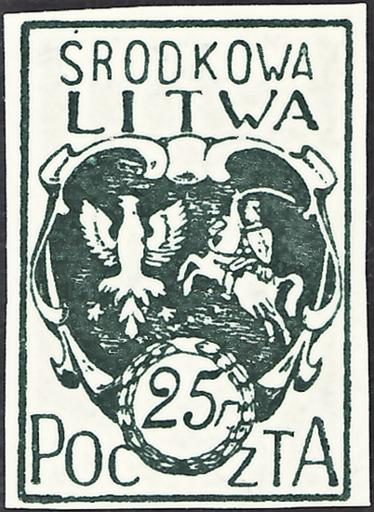 Keywords: Central Lithuania 1920 MiNr 020B B002.png Stamp of Central Lithuania; 1921; Michel No 20B postage stamp issue; 25 F ; escutcheon drawing<br /> Nominal value 25 Fenigi<br /> Color black green several tonality <br /> Watermark none<br /> Postage validity other date 1921-03 - other date 1922-04-16 <br /> Paper common white paper scan of original other date 1921-03 Postal administration for Central Lithuania Polishsymbol PD-LT-exempt stamps PD-old-70 <gallery> File Central Lithuania 1921 MiNr 020A B002 png The same stamp as perforated stamp MiNr 20A </gallery> Philately Escutcheon drawing with the state symbols of Poland and Lithuania other date 1921-03 Postal administration for Central Lithuania F Zaniewski J Zawadski recess printing 5 000 000 perforated + imperforated none imperforated Mittellitauen Nr 20B 1921 stamps of Central Lithuania Green stamps Imperforate stamps Coats of arms of Lithuania on stamps |