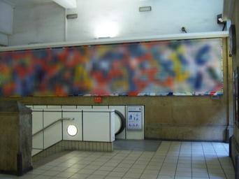 | Keywords: Central Station Metro station, 7 October 2013 (7).JPG Central Station Metro station Newcastle upon Tyne This is the view east inside the mainline station lobby of the Metro station inside the Neville Street building of the station The stair and escalator on the left and a lift out of shot to the left rear provide access to the underground ticket hall while the mainline station concourse is through the arches on the right On the wall is the the abstract artwork - Wakesweek by Stephen McNulty own 2013-10-07 Ultra7 Central Station Metro station Wakesweek by Stephen McNulty |