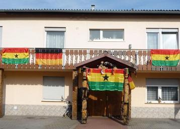 Keywords: Cephas Bansahs Haus bei der WM.jpg en Céphas Bansah's house with flags own Immanuel Giel Céphas Bansah