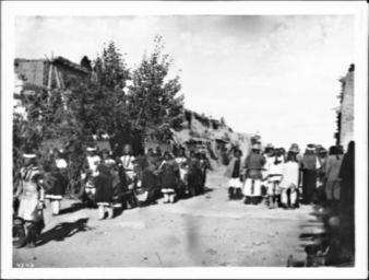 | Keywords: Ceremonial procession for the Fiesta de San Esteban, Acoma Pueblo, New Mexico, 1886 (CHS-4548).jpg en <br> Ceremonial procession for the Fiesta de San Esteban Acoma Pueblo New Mexico 1886 Photograph blurred of a procession of dancers and singers at Fiesta de San Esteban Saint Stephen Acoma Pueblo New Mexico 1886 About a dozen dancers left wear traditional garb and dance before the kisi located in the midst of the tree branches and bushes A small crowd of onlookers right stand across the dirt road near the three-story adobe buildings of the pueblo Ladders can be seen leaning against the exterior of the cube-shaped buildings of the pueblo in the background Call number CHS-4548 Legacy record ID chs-m16883; USC-1-1-1-13461 Photographer James George Wharton Filename CHS-4548 Coverage date 1886 Part of collection California Historical Society Collection 1860-1960 Type images Geographic subject city or populated place Acoma Pueblo Repository name USC Libraries Special Collections Accession number 4548 Microfiche number 1-160-48 Archival file chs_Volume96/CHS-4548 tiff Part of subcollection Title Insurance and Trust and C C Pierce Photography Collection 1860-1960 Repository address Doheny Memorial Library Los Angeles CA 90089-0189 Geographic subject country USA Format aacr2 2 photographs glass photonegative photoprint b w ; 17 x 22 cm Rights Digitally reproduced by the USC Digital Library; From the California Historical Society Collection at the University of Southern California Subject adlf tribal areas Project USC Repository email specol usc edu Identifying number unidentified no James-1382 Contributing entity California Historical Society Date created 1886 Publisher of the digital version University of Southern California Libraries Format aat photographic prints; photographs Geographic subject state New Mexico Format glass plate negatives Access conditions Send requests to address or e-mail given Phone 213 821-2366; fax 213 740-2343 Subject file heading Indians -- Acoma Subject lcsh Indians of North America; Acoma Indians Subject Acoma Indians; Acoma; Acoma Indians 1886 date created George Wharton James 1858 1923 http //digitallibrary usc edu/cdm/ref/collection/p15799coll65/id/16805 PD-old-70-1923 Images from USC Digital Library uploaded by Fæ Photographs by George Wharton James California Historical Society Collection 1860-1960 Glass plate negatives Acoma Pueblo 1886 in New Mexico 1886 in dance |