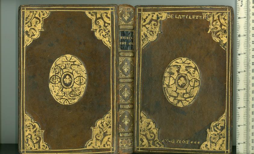 | Keywords: Ces presentes heures a lusaige de Chartres sont au long sans riens requerir- auec les miracles nostre dame, les figures de lapocalipse de la bible, des triumphes de Cesar. G.L. --Philippe - Upper and lower cover and spine (C27i8).jpg Style Centre and cornerpiece Azured or hatched motifs; Caption Upper and lower cover and spine; Colour Brown; Edge Gilt exhibition history Decorative Technique Tooled in gold; Cover Material Calf Rebacked using original boards spine replaced Tooling extremely unclear De Lavilette Y Gviot tooled in gold on upper cover Green pink red yellow and black marbled endleaves object history Text 1508; Paris ; Unspecified object type Cc-zero place of creation Binding France place of discovery Unspecified British Library image http //www bl uk/catalogues/bookbindings/LargeImage aspx RecordId 020-000017927 ImageId ImageId 56801 Copyright BL Ces presentes heures a lusaige de Chartres sont au long sans riens requerir auec les miracles nostre dame les figures de lapocalipse de la bible des triumphes de Cesar G L Philippe Pigouchet for Simon Vostre Paris 1508 1508 Uploaded with GWToolset Ces presentes heures a lusaige de Chartres sont au long sans riens requerir auec les miracles nostre dame les figures de lapocalipse de la bible des triumphes de Cesar G L Philippe - Upper and lower cover and spine C27i8 http //www webarchive org uk/bldatasets/bindings/c27i8 jpg Bookbinding 16th-century bookbinding British Library Bookbindings |