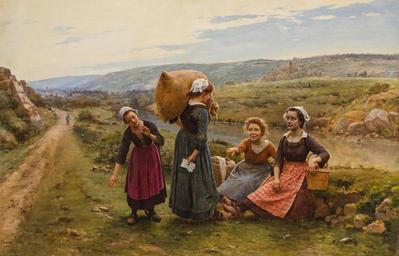 | Keywords: César Pattein A mysterious letter 1905.jpg A mysterious letter Signed and dated 'César Pattein 1905' lower right oil on canvas 86 5 x 131 cm http //www bonhams com Bonhams 1905 César Pattein 1850-1931 PD-old-70-1923 Images from Bonhams César Pattein 1905 paintings Letters in art Carrying in art Paintings of country roads Paintings of women sitting on the ground outdoors Paintings of peasants | ||||