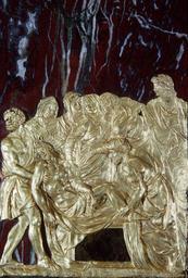 | Keywords: Cesare Targone - Appliqué with the Entombment - Walters 57564.jpg Made from a paper-thin sheet of gold this appliqué to be applied to another surface such as marble or jasper is executed in repoussé pressed out from the back It is a virtuoso piece by Cesare Targone a goldsmith born in Venice who was active primarily in Rome and Florence during the late 16th century This precious work may have been executed while Targone was in Rome which would explain why it is stylistically close to the art of Guglielmo della Porta The use of gold indicates that the artist and patron wanted a relief of the utmost sumptuousness and delicacy Pure gold is rarely used because it is very soft making it impractical for objects that sustain pressure; indeed the faces of some of the women have been slightly flattened ca 1580 Renaissance gold on jasper mount with slate backing cm 18 5 17 accession number 57 564 6831 Henry Walters Baltimore date and mode of acquisition unknown Walters Art Museum Henry Walters Acquired by Henry Walters World of Wonder The Walters Art Gallery Baltimore 1971-1972 place of origin Florence Italy Walters Art Museum license Renaissance applied arts in the Walters Art Museum Plaquettes Cesare Targone Media contributed by the Walters Art Museum needs category review |