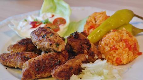 Keywords: cevapcici meat minced meat djuvec zaziki eat rice lunch pepperoni green red meatballs delicious nutrition fried food minced ' meat enjoy cook