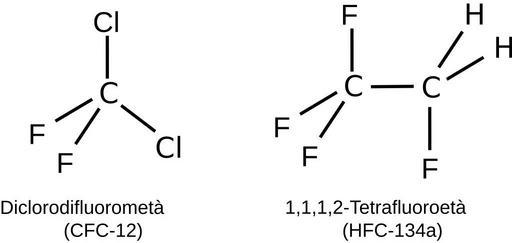 Keywords: CFC-12 HFC-134a(català).svg Mol·lecules de CFC-12 i HFC-134a http //en wikipedia org/wiki/Image CFC-12_suva134a svg 2008-04-16 Traducció a la llengua catalana per Albert Mestre Organochlorides Organofluorides