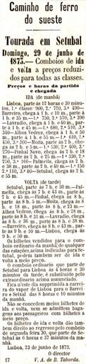 Keywords: CFS Setubal bullfighting advertisement 3.jpg pt Anúncio do Caminho de Ferro do Sueste em Portugal para comboios especiais a preços reduzidos de Lisboa via fluvial até ao Barreiro até Setúbal para uma tourada Esta imagem foi publicada no Diario Illustrado n º 335 de 27 de Junho de 1873 e digitalizada pela Biblioteca Nacional de Portugal en Advertisement of the Caminho de Ferro do Sueste Portuguese Southeastern Railway for special trains at reduced prices from Lisbon boats to Barreiro to Setúbal for a bullfighting event This image was published on the Diario Illustrado newspaper No 335 of 27th June 1873 and scanned by the Biblioteca Nacional de Portugal 1873-06-23 http //purl pt/14328/1/j-1244-g_1873-06-27/j-1244-g_1873-06-27_item2/j-1244-g_1873-06-27_PDF/j-1244-g_1873-06-27_PDF_24-C-R0150/j-1244-g_1873-06-27_0000_1-4_t24-C-R0150 pdf Caminho de Ferro do Sueste Institution Institution Biblioteca Nacional de Portugal other versions Custom license marker 2015 11 23 Anonymous-EU Public transport information in Portugal Caminho de Ferro do Sueste 1873 in rail transport in Portugal Ferries in Lisbon Linha do Alentejo Linha do Sul Images from the Biblioteca Nacional de Portugal |
