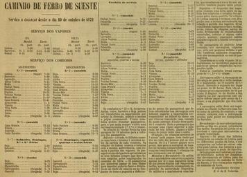 | Keywords: CFS Timetable 1872.jpg pt Horários do Caminho de Ferro do Sueste divisão do governo Português que explorava os comboios do Alentejo até à Margem Sul do Rio Tejo e os navios a vapor desde a Margem Sul até Lisboa Esta imagem foi publicada no Diario Illustrado n º 103 de 11 de Outubro de 1872 e digitalizada pela Biblioteca Nacional de Portugal en Timetable of the Caminho de Ferro do Sueste South Eastern Railway that managed the trains from the Alentejo region to the South bank of the Tagus River and steam ferrys from the South bank to Lisbon in Portugal This image was published on the Diario Illustrado newspaper No 103 of 11th October 1872 and scanned by the Biblioteca Nacional de Portugal 1872-10-11 http //purl pt/14328/1/j-1244-g_1872-10-11/j-1244-g_1872-10-11_item2/j-1244-g_1872-10-11_PDF/j-1244-g_1872-10-11_PDF_24-C-R0150/j-1244-g_1872-10-11_0000_1-4_t24-C-R0150 pdf Caminho de Ferro do Sueste other versions Institution Institution Biblioteca Nacional de Portugal Custom license marker 2015 07 29 Anonymous-EU Uploaded with UploadWizard Train timetables in Portugal Caminho de Ferro do Sueste 1872 in rail transport in Portugal Ferries in Lisbon Linha do Alentejo Linha de Évora Ramal de Moura Linha do Sul Images from the Biblioteca Nacional de Portugal |