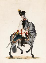 | Keywords: CH-NB - Hohenzollern - Collection Gugelmann - GS-GUGE-FEYERABEND-E-32.tif Information Hohenzollern; Der Reiter sitzt nach rechts auf einem grauen Pferd das Schwert in der Hand Er trägt einen Zweispitz mit schwarzweissem Federbusch Österreichische Farben Weisser Uniformrock darüber ein schwarz gefärbter Kürass mit gelben Epauletten Schwarze Halsbinde der Kürass oben rot eingefasst Ärmel-Aufschläge rot ebenfalls sind die Uniform-Schösse rot eingefasst Gelbe Handschuhe Goldknöpfe Sehr hohe Schaftstiefel Schabracke blau rot-gold-rot eingefasst ; Hohenzollern; Aquarell; Gouachemalerei Swiss National Library CH-NB-Collection Gugelmann PD-old-100 User Swiss National Library/Attribution-Recommendation GS-GUGE-FEYERABEND-E-32 http //www helveticarchives ch/detail aspx ID 477891 helveticarchives ch; Swiss National Library Prints and Drawings Department Uploaded with GWToolset CH-NB - Hohenzollern - Collection Gugelmann - GS-GUGE-FEYERABEND-E-32 http //upload-glam wikimedia ch/Gugelmann/GS-GUGE-FEYERABEND-E-32 tif Collection Gugelmann Media contributed by the Swiss National Library Franz Feyerabend Cavalry of Germany House of Hohenzollern Swabian branches 1793 in Switzerland 1793 paintings Saddle blankets |