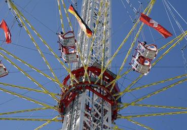 Keywords: chain aviator tower high 80m fair hustle and bustle year market folk festival carnies fairground pleasure fun leisure fun activity colorful entertainment speed color fast sit chains view no fear of heights upward height turn attraction construction