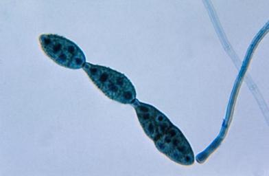 | Keywords: Chain of conidia of a Alternaria sp. fungus PHIL 3963 lores.jpg This photomicrograph shows a chain of conidia of a Alternaria sp fungus which can be a cause of phaeohyphomycosis The spores of Alternaria sp fungi are multi-cellular pigmented and are produced in straight chains or branching chains The end of the conidium nearest the conidiophore is round as it tapers towards its apex imparting a beak-like appearance Content Providers s CDC/Dr Lucille K Georg Creation Date 1955 Copyright Restrictions None - This image is in the public domain and thus free of any copyright restrictions As a matter of courtesy we request that the content provider be credited and notified in any public or private usage of this image http //phil cdc gov/phil_images/20030612/9/PHIL_3963_lores jpg PD-USGov Fungal morphology and anatomy Alternaria Microscopic images of fungi |