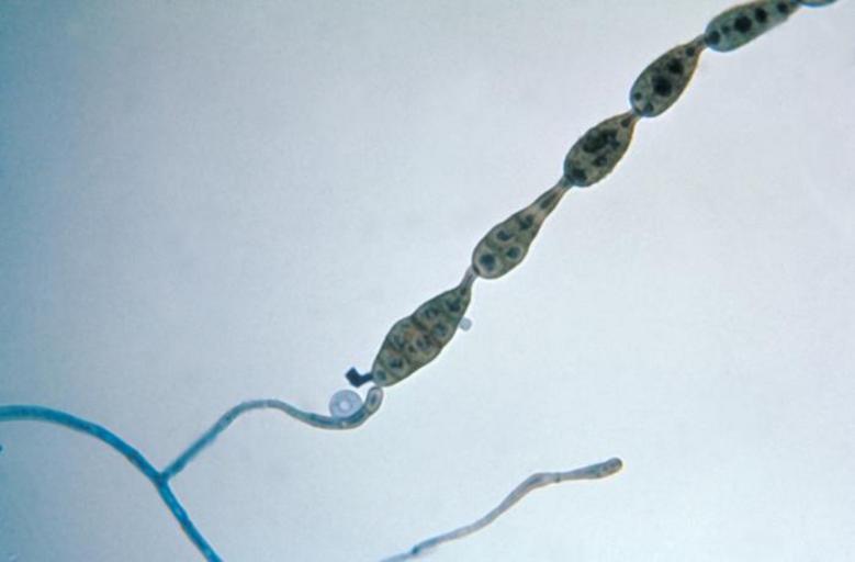 Keywords: Chain of conidia of a Alternaria sp. fungus PHIL 3962 lores.jpg This photomicrograph shows a chain of conidia of a Alternaria sp fungus which can be a cause of phaeohyphomycosis The spores of Alternaria sp fungi are multi-cellular pigmented and are produced in straight chains or branching chains The end of the conidium nearest the conidiophore is round as it tapers towards its apex imparting a beak-like appearance Content Providers s CDC/Dr Lucille K Georg Creation Date 1955 Copyright Restrictions None - This image is in the public domain and thus free of any copyright restrictions As a matter of courtesy we request that the content provider be credited and notified in any public or private usage of this image http //phil cdc gov/phil_images/20030612/8/PHIL_3962_lores jpg PD-USGov Fungal morphology and anatomy Alternaria Microscopic images of fungi |