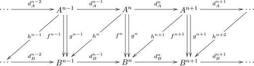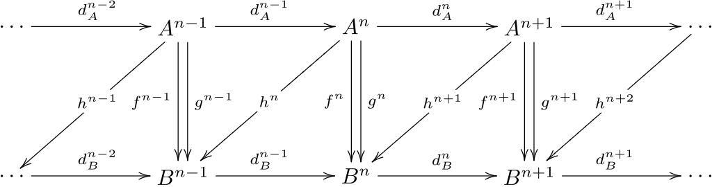 | Keywords: Chain homotopy.svg LaTeX source <pre> \documentclass amsart \usepackage amsmath amssymb nopageno \usepackageall xy \begin document \begin equation \xymatrix +3em \dots \arr d_A n - 2 A n - 1 \arr d_A n - 1 \ar <0 5ex>d g n - 1 \ar <-0 5ex>d_ f n - 1 \ardl +<1ex 1ex> \scriptstyle h n - 1 A n \arr d_A n \ar <0 5ex>d g n \ar <-0 5ex>d_ f n \ardl +<1ex 1ex> \scriptstyle h n A n + 1 \arr d_A n + 1 \ar <0 5ex>d g n + 1 \ar <-0 5ex>d_ f n + 1 \ardl +<1ex 1ex> \scriptstyle h n + 1 \dots \ardl +<1ex 1ex> \scriptstyle h n + 2 \\ \dots \arr d_B n - 2 B n - 1 \arr d_B n - 1 B n \arr d_B n B n + 1 \arr d_B n + 1 \dots \end equation \end document </pre> Let A be an additive category The homotopy category K A is based on the following definition if we have complexes A B and maps f g from A to B a chain homotopy from f to g is a collection of maps <math>h n \colon A n \to B n - 1 </math> not a map of complexes such that <math>f n - g n d_B n - 1 h n + h n + 1 d_A n </math> or simply <math> f - g d_B h + h d_A </math> This can be depicted as shown in the diagram en Image Chain homotopy jpg 2007-03-19 2008-02-06 en User Ryan Reich User Stannered Ryan Reich en Image Chain homotopy jpg Homological algebra Mathematical diagrams Images with LaTeX source code |