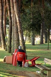 Keywords: chair red plastic sit man seat still life shadow trees rest lonely