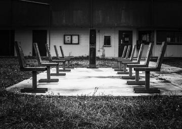Keywords: chairs empty abandoned ghost town buildings old building rusty outside strange surreal prison jail immokalee florida crime architecture iron metal black and white nightmare dream