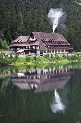 Keywords: chalet high reflection slovakia steam water mountains tarn lake