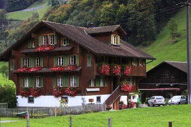 Keywords: chalet mountain hut home building switzerland red brown flowers landscape green