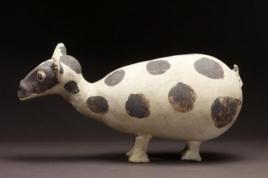 | Keywords: Chancay - Llama Effigy - Walters 20092049 - Side A.jpg The llama a native camelid of the Americas touched all aspects of Andean life The llama- the only native American beast of burden-was used primarily to transport goods from the coastal deserts to the highest mountain plains Well adapted to the extremes of the Andean environment including climate terrain and altitude the llama was at the heart of every Andean home The llama and its camelid cousins alpaca guanaco and vicuña provided the all-important hairs that were spun into fibers to weave warm garments of considerable strength and durability Such clothing was crucial for survival during cold Andean nights and in the altiplano highlands Llamas also provided body heat for shepherds and other laborers who could not return to a warm home every night Llama blood was an important ritual offering and its meat was occasionally consumed for protein although the high value of the living animal made these latter uses infrequent and of special significance During the Late Intermediate Period the Chancay Valley and adjacent Chillón Drainage developed an energetic corporate style of architecture and art Large amounts of ceramics were produced and distributed among the ruling elite as well as those of lesser status Among these are the distinctive mold-made and hand-modeled sculptures of humans both men and women and animals This engaging sculpture of a young llama captures the animal's natural inquisitiveness It cocks its head slightly to the side as if watching intently some unseen activity The artist divided the llama's face into two halves painting one side white and the other black following the Andean principle of duality and balance The artist also designated the animal's sex as male and embellished the body with black spots one of the natural coloration schemes of the animal Typical of the distinctive Chancay pottery style is the somewhat haphazard modeling and painting which enhance the piece's charm AD 1000-1470 Late Intermediate earthenware slip paint cm 21 11 40 39 16 accession number 2009 20 49 80204 Economos Works of Art date and mode of acquisition unknown John G Bourne 1990s by purchase Walters Art Museum Gift of John Bourne 2009 place of origin Central Coast Walters Art Museum license Pre-Columbian art in the Walters Art Museum Chancay pottery Llamas in art |