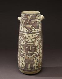 | Keywords: Chancay - Vessel - Walters 20092035 - Back.jpg The Chancay art style dominated Peru's Central Coast during the Late Intermediate Period although there was no centralized overarching state authority ruling the region Textiles and pottery were the primary artistic media the former being among the most colorful visually complex and technically excellent weavings ever produced in Peru Chancay pottery on the other hand is often rather casually or carelessly painted its slip characterized by a matte surface finish and a palette restricted to white and black with the infrequent addition of red or beige The low-fired Chancay ceramics make them susceptible to surface damage unlike the earlier pottery of the Moche Nasca and Waricultures On the other hand Chancay painting can be as lively as that of any Andean tradition The acute difference in quality between Chancay ceramics and textiles reflects sociopolitical divisions in Chancay culture Burial patterns indicate that the painted ceramics were consumed by all levels of Chancay society whereas fine textiles and precious metal objects were restricted to members of higher status As elsewhere in the Andean world artistic quality and materials conveyed messages of hierarchy and power This tall narrow vessel features the frontal rendering of a male figure He grasps a puma-headed staff in each hand and two serpent-headed rays emanate from his head These pan-Andean features link the figure to traditional depictions of supernatural beings or deities and shamans The bird painted at the top of the vessel reflects this theme in its crescent-shaped head adornment which distinguishes the Sicán Deity or Sicán Lord who may be a culture hero or a deity among cultures to the north The Sicán Lord is associated primarily with the Sicán and later Chimú societies of the North Coast although the Chimú extended their influence over the Chancay people at the end of the Late Intermediate Period It is not improbable that this symbol of divinity and/or sacred ancestry was adopted by the Chancay The painter of this tall vessel animated the scene by filling the background with black avian footprints which at the least lend motion to the bird if not implying its ritual performance AD 1000-1470 Late Intermediate earthenware slip paint cm 29 69 12 19 accession number 2009 20 35 80190 Economos Works of Art date and mode of acquisition unknown John G Bourne 1990s by purchase Walters Art Museum Gift of John Bourne 2009 place of origin Central Coast Walters Art Museum license Pre-Columbian art in the Walters Art Museum Chancay pottery Earthenware |