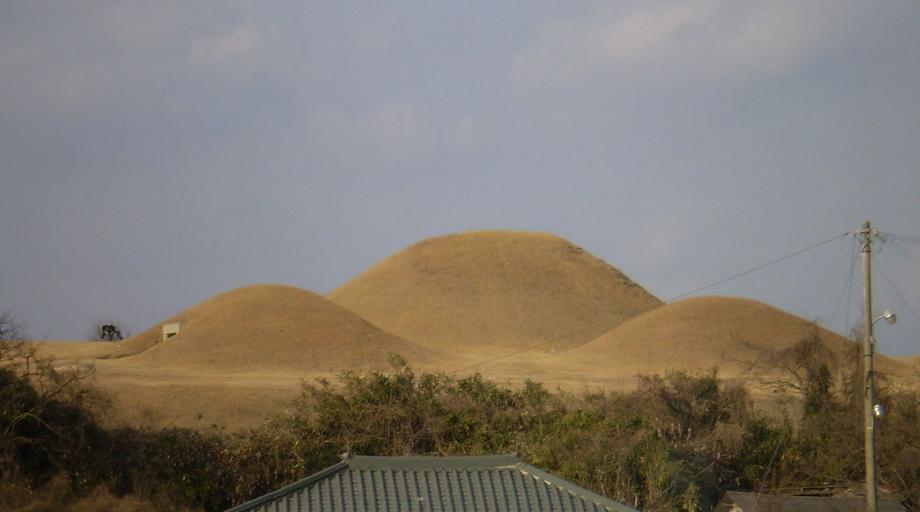 Keywords: Changnyeong tombs below.jpg View from below toward part of the Bihwa Gaya royal tomb complex in Changnyeong Gyeongsangnam-do South Korea Note the doorway leading into one of the tombs Own 2007-01-27 Taken by User Visviva and released into the public domain Royal tombs of Bihwa Gaya |