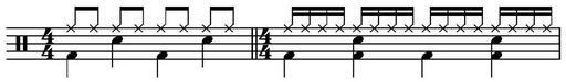 | Keywords: Characteristic rock and disco drum patterns.png Characteristic rock and funk Bolton Ross 2001 Funk Guitar The Essential Guide p 5 ISBN 0-634-01168-5 drum pattern followed by disco drum pattern Schroedl Scott 2001 Play Drums Today p 15 Hal Leonard ISBN 0-634-02185-0 notates the basic rock beat using half notes on the bass drum and a quarter note ride cymbal pattern while four to the floor p 15 features steady quarter notes on the bass drum Morton James 1990 You Can Teach Yourself Drums p 32 Mel Bay ISBN 1-56222-033-0 gives as the first commmonly used rock beats featuring an eighth-note ride pattern as the above pattern but riding the hi-hat not the ride cymbal Rock groups such as U2 and INXS have used the second beat notated with one hand for the hi-hat/snare pattern and one for the bass p 55 Basic beats in Mattingly Rick 2006 All About Drums p 42 Hal Leonard ISBN 1-4234-0818-7 include four to the floor with quarter note hi-hat ride described as appropriate for hard rock with eighth-note ride pattern appropriate for a pop song with swung eighths on the backbeat of the ride pattern for a jazz feel and second notated pattern above descried as basic 4/4 'beat' with a sixteenth-note feel with hi-hat ride Marshall Wayne 2006 Giving Up Hip-hop's Firstborn A Quest for the Real after the Death of Sampling Callaloo 29 3 868-892 ISSN 0161-2492 The funk-derived breaks that have long served as hip-hop's rhythmic bedrock are also characterized by their common features which tend to include a kick drum on the downbeats snares on the off beats and a hi-hat dividing each measure at the level of the eighth or sixteenth note Finally a tempo of anywhere between 80 and 110 beats per minute will evoke the recognizable feel of a hip-hop beat 2008-07-29 own Created by Hyacinth 22 50 28 July 2008 using Sibelius and Paint See File Characteristic rock drum pattern mid File Characteristic disco drum pattern mid Should be text Hyacinth en Original upload log en wikipedia ftcg page en wikipedia Characteristic_rock_and_disco_drum_patterns png wikitable - 04 50 29 July 2008 1 364 × 200 6 113 bytes Hyacinth w en <nowiki> Characteristic rock and funk Bolton Ross 2001 Funk Guitar The Essential Guide p 5 ISBN 0634011685 drum pattern followed by disco drum pattern Schroedl Scott 2001 Play Drums Today p 15 Hal Leonard ISBN </nowiki> Disco Drum patterns Backbeat rhythm |