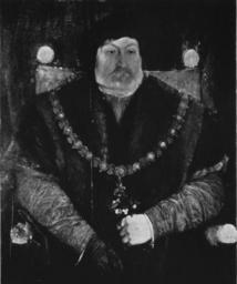 | Keywords: Charles-Brandon, 1st Duke of Suffolk in his fifties.gif Artwork unknown Hans Holbein the younger en Portrait with overpaints cleaned off <br> Paul Ganz The hitherto little-known portrait of Charles Brandon Duke of Suffolk which we publish here for the first time in its original form was shown in 189o at the Tudor exhibition No 38 of the Catalogue as a work by Hans Holbein the Younger PLATE I It represents the powerful favourite and brother-in-law of King Henry VIII in his fifties seated in an armchair covered with leather of cinnabar colour ornamented with gold The broad-shouldered rather corpulent gentleman wears his black beret tilted over the right ear on the top of the closely-fitting cap; his doublet is made of crimson cloth decorated with quilted ornamentation while his white shirt is adorned with a black embroidered border visible at the wrists and around the neck His short-sleeved black velvet coat trimmed with fur at the elbows is partly covered by a surcoat made of black silk with a broad border of marten fur over which hangs the collar of the Garter with St George and the ends of which are visible below the arms hiding the chair to the left His right hand is gloved in dark grey and holds the other glove wihile his left holds a small bouquet of flowers which no doubt has a symbolical meaning The background is composed of a dark green curtain ornamented with a red-brown design s 1540 Oil on panel Institution NPG The Burlington Magazine for Connoisseurs Vol 57 No 329 Aug 1930 pp 58-61+64-65 Paul Ganz A Rediscovered Portrait of Charles Brandon Duke of Suffolk by Holbein http //www npg org uk/collections/search/portrait php search ap npgno 516 eDate lDate npg org uk other versions <gallery>Charlesbrandondukesuffolk3 jpg Charles Brandon 1st Duke of Suffolk from NPG jpg</gallery> PD-old-100 DEFAULTSORT 1545c; Charles Brandon b/w 16th-century unidentified painters 16th-century portrait paintings in the National Portrait Gallery London Charles Brandon 1st Duke of Suffolk 1540s oil on canvas paintings in the United Kingdom 1540s portrait paintings Male 16th-century oil portraits of sitting men at half length Black and white reproductions of portrait paintings in color Portrait paintings of men wearing black berets Collar of the Order of the Garter in portrait paintings Fur garments in art Male portraits holding glove Male fur clothing in art Portraits of men holding flowers Schaube Fur fashion in 1545 |