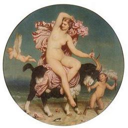 | Keywords: Charles Gleyre - Venus Pandemos.jpg Artwork Creator Charles Gleyre A nude Venus riding a goat in a seaside setting She holds a mantle in her right hand and goat horn in her left while watching Cupid fly in the opposite direction A satyr looking at Venus leads the goat by its beard and holds a torch 1852-53 oil canvas Square canvas with a feigned tondo 46cm Present location unknown http //collection-lingenauber org/files/Gleyre_Charles__1806-74_sig _can_tondo_46_cm pdf Collection Lingenauber Monaco object history Camille Duplan possibly bought directly from Gleyre around 1854 until 28th January 1876; Louis de Clercq 5 rue Masseran Paris until at least 1885; Collection Lingenauber Monaco credit line Signed with a monogram lower right accession number http //www epoesie org/2011/03/richard-dehmel-venus-pandemos html PD-old-100-1923 Charles Gleyre Aphrodite in post-antique paintings People with goats in art Paintings of goats Cupid with torch Satyrs in paintings Paintings of Cupido 1850 mythological paintings Paintings of nude women Paintings of women with animals Aphrodite Pandemos Paintings with signatures lower right Uploaded with UploadWizard |