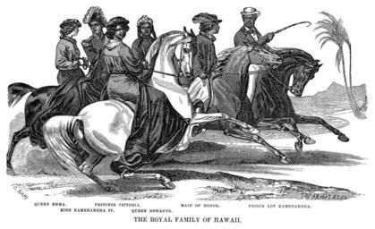 | Keywords: Charles Nahl, The Royal Family of Hawaii, engraved by Thomas Armstrong.jpg en The Royal Family of Hawaii Left to right Queen Emma King Kamehameha IV Princess Victoria Queen Dowager Maid of Honor and Prince Lot Kamehameha Lithograph by Thomas Armstrong after an original portrait by Charles Nahl in the 1856 issue of Hutchings' California Magazine The original was a life-size oil painting by Charles Nahl exhibited during the Mechanics' Institute Fair in 1857 at San Francisco In 1858 this painting and Nahl's Emigrants Crossing the Plains were considered the best works in the exhibition The original no longer exist http //books google com/books id lB_F9CffeN8C lpg PA230 pg PA230http //collections si edu/search/results htm q record_ID siris_aeci_51831 cite book Hutchings' illustrated California magazine 205 Hutchings Rosenfield San Francisco 1856 http //archive org/details/hutchingsillustr03sanf portrait drawn by Creator Charles Christian Nahl engraving by Thomas Armstrong 1856 Charles Christian Nahl House of Kamehameha Royalty of Hawaii Queen Emma of Hawaii Kamehameha IV Victoria KamÄmalu Queen Kalama Kamehameha V Horses in Hawaii Native Hawaiians in art Hawaii in art Horse riding in engravings 1856 engravings San Francisco in the 1850s Hawaii in the 1850s 19th-century family portraits of royalty PD-old-auto 1878 |
