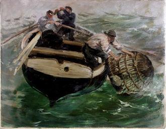 | Keywords: Charles Napier Hemy - Hauling in Lobster Pots.jpg Charles Napier Hemy Charles Napier Hemy 1841 - 1917 oil paper cm 43 2 55 9 Institution Laing Art Gallery http //www bbc co uk/arts/yourpaintings/paintings/hauling-in-lobster-pots-36467 BBC Your Paintings object history credit line gift from Mrs Charles Napier Hemy 1935 This is believed to have been painted at Falmouth and was used as a study for a larger painting Hemy has painted the figures in a very loose way but he has paid close attention to the details of the lobster pot and the waves around the boat He has also looked closely at the way the figures are moving whether straining against the oars or stretching to pull the pot aboard the boat<ref>http //www bridgemanart com/asset/427330 Bridgeman Art Library</ref> reflist accession number TWCMS G17028 427330 PD-old-auto-1923 1917 Charles Napier Hemy Paintings in Laing Art Gallery Fish traps in art Lobster traps Sou'wester in art Paintings of fishermen sitting in boats |
