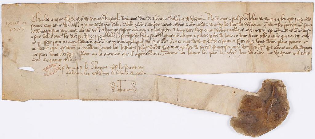 Keywords: Charles, régent du royaume demande à Jean de Duison de faire abattre Toutes les forteresses qui pourraient nuire au royaume et à la ville de Paris, notamment... - Archives Nationales - AE-II-376.jpg Charles régent du royaume demande à Jean de Duison grand prieur des hospitaliers de France capitaine de la ville et de la vicomté de Paris de faire abattre Toutes les forteresses qui pourraient nuire au royaume et à la ville de Paris notamment celle de Bolon Mandement donné au Louvre 17 mars 1359 1359-03-17 parchment Institution Archives nationales France AE/II/376 object history exhibition history credit line Archives Nationales cooperation project PD-old-100-1923 accession number AE/II/376 K//948/40 Collections of Archives nationales France 1359 in FranceMedia contributed by the Archives Nationales France /5 Charles V of France |