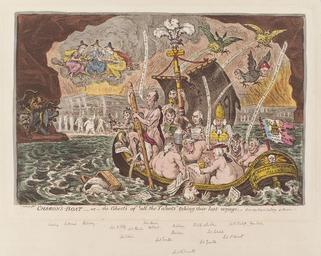 | Keywords: Charon's boat - or - the ghost's of All the Talents taking their last voyage by James Gillray.jpg Charon's boat - or - the ghost's of All the Talents taking their last voyage by James Gillray died 1815 published 1807 See source website for additional information This set of images was gathered by User Dcoetzee from the National Portrait Gallery London website using a special tool All images in this batch have been confirmed as author died before 1939 according to the official death date listed by the NPG D12895 1807 Creator James Gillray File Charon's Boat jpg PD-old-100 National Portrait Gallery London James Gillray Charon |