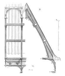 | Keywords: Charpente.cathedrale.Ely.png La nef et les transsepts de la cathédrale d'Ély sont encore couverts par une belle charpente qui date de la fin du XIV<sup>e</sup> siècle Nous donnons 31 une ferme de cette charpente ainsi que l'entre-deux des fermes La grande courbe A B est d'un seul morceau; elle s'assemble à sa base dans le grand blochet C à son sommet dans le faux poinçon D Carpentry Viollet-le-Duc Ely Cathedral Viollet-le-Duc | ||||