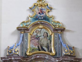| Keywords: Châtenois StGeorges49.JPG fr Alsace Bas-Rhin Châtenois Eglise Saint-Georges Autel secondaire Tableau de René Kuder Saint-Sébastien 1958 own Rh-67 2011 cc-by-sa-3 0 PM67001594 IM67006655 Taken with Canon PowerShot SX20 IS Photographs of Châtenois by Ralph Hammann Artwork / Œuvre d'art / Kunstwerk oil canvas cm Eglise Saint-Georges Châtenois Autel secondaire PM67001595 IM67009304 object history Tableaux peints par René Kuder en 1958 pour les couronnements des autels retables secondaires other versions Ralph Hammann PD-old accession number Altars in Église Saint-Georges de Châtenois 18th-century altars in Alsace Baroque altars in Alsace Altars of Saint Sebastian in France Paintings of Saint Sebastian in France Baroque church paintings in Alsace 20th-century church paintings in Alsace Objets monuments historiques in Châtenois Bas-Rhin Objets monuments historiques in Bas-Rhin church paintings |