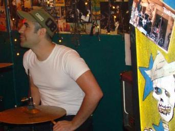Keywords: Chato Calambres.jpg es Chato baterista de Los Calambres en acción durante la gira del grupo en Europa Aquí en el Rock Palace de Madrid España own OscMaster Musicians from Mexico Music of Mexico Garage Surf