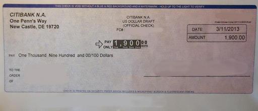 | Keywords: Check used in Internet scam with victims name removed.JPG en An allegedly fraudulent check in an Internet scam It was sent by a buyer really the scammer to a seller the target -- in this case somebody selling a piano on Craigslist to buy the piano plus moving expenses The target deposits the check thinks the money is in his or her account then wires money to the supposed movers really the scammer's account ; but the check bounces the movers never show and the victim has been cheated 2013-03-14 19 36 25 own Tomwsulcer cc-zero Uploaded with UploadWizard March 2013 in the United States 2013 documents Bank checks Craigslist Checks of the United States Fraud Taken with Sony DSC-W530 |