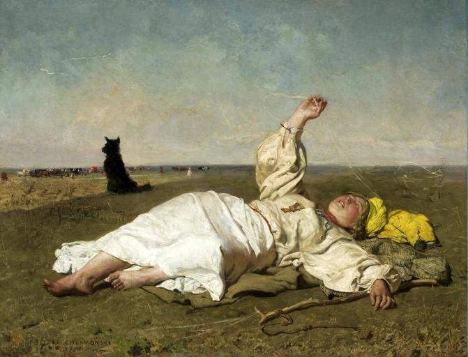 | Keywords: Chełmoński Indian summer.jpg Artwork Creator Józef Chełmoński 1875 oil canvas cm 119 7 156 5 Institution National Museum Warsaw 1 accession number MP 423 object history credit line JÓZEF CHEŁMOŃSKI / 1875r w Warszawie signature/date/location Painted in Warsaw shortly after return from Ukraine It depics a peasant woman in Ukrainian folk costume with a thread of gossamer in her hand http //www pinakoteka zascianek pl/Chelmonski/Images/Babie_lato jpg www pinakoteka zascianek pl See below PD-old-100-1923 1914 DEFAULTSORT 1875; Indian summer Paintings by Józef Chełmoński in the National Museum in Warsaw 1875 paintings Chełmoński Józef 1870s paintings from Poland Chełmoński Józef 19th-century oil paintings of recumbent women at full length 19th-century paintings of dogs Indian summer Paintings of recumbent women on the ground outdoors Paintings of Ukrainian peasants Spider silk |