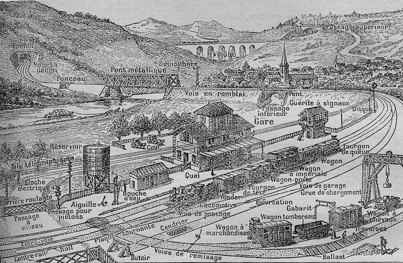 Keywords: Chemindefer.1912.jpg Elementos típicos de un ferrocarril a principios del siglo XX Petit Larousse 1912 PD-old Rail transport diagrams