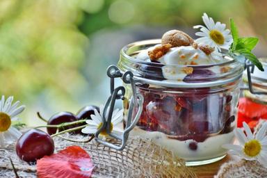 Keywords: cherries cherry dessert cream yogurt dessert sweet dish delicious benefit from fruit quark food sweet red close