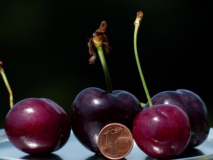 Keywords: cherries large huge size comparison cent penny coin monster cherry red sweet delicious sweet cherries summer fruit fruit ripe purple