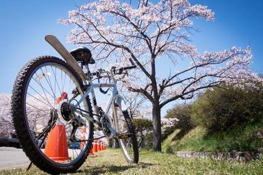 Keywords: cherry blossom bicycle bike spring blossom pink tree road flower floral perspective sky blue