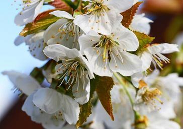Keywords: cherry blossom edible cherry sweet cherry prunus flower off-white petals tree spring sepals anther stamen filament close-up macro detail