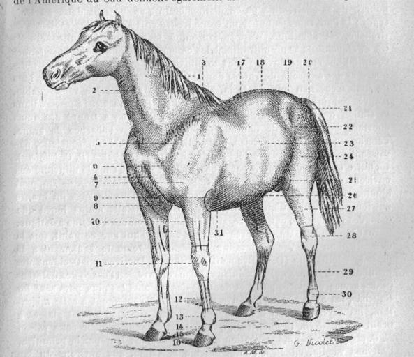 Keywords: ChevRegionsRaillet1895MeyerCh.jpg en The horse Equus caballus anatomical regions fr Les régions du corps du cheval Equus caballus <br /> 1 encolure 2 gouttière jugulaire 3 garrot 4 poitrail 5 épaule 6 angle de l'épaule 7 bras 8 ars 9 coude 10 avant-bras 11 genou 12 canon 13 boulet 14 paturon 15 couronne 16 pied 17 dos 18 reins 19 croupe 20 queue 21 hanche 22 flanc 23 côtes 24 cuisse 25 grasset 26 ventre 27 jambe 28 jarret 29 canon 30 boulet 31 passage des sangles ” Raillet Alcide Traité de zoologie médicale et agricole 1303 p page 1161 1895 Paris Asselin et Houzeau domaine public décès de l'auteur 1930 Meyer Christian 2011-04-14 PD-old Horse whole external body views with legends |
