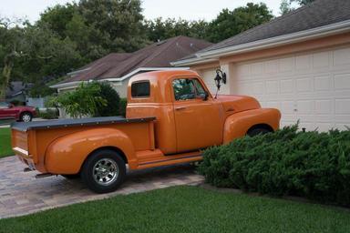 Keywords: chevrolet orange truck old antique classic funky general pick-up truck mode of transport land vehicle side view transportation vehicle